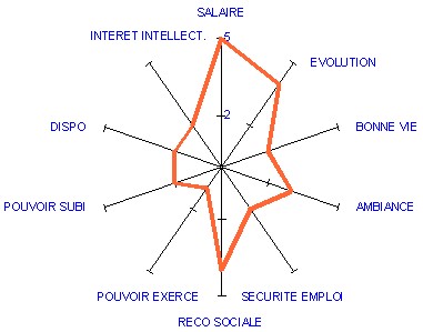 Voici maintenant mes intuitions sur le sujet : normalement, chaque emploi devrait remplir la même surface c’est-à-dire que ce que l’on gagne par exemple en liberté, on le perd par exemple en salaire. On suppose que toute évolution positive sur un axe sera compensée par une régression sur un autre axe. Par exemple : les emplois qui laissent beaucoup de disponibilité et font subir peu de pouvoir… sont généralement moins bien payés. Donc tous les emplois se valent, car la surface intérieure du graphe reste de même dimension.