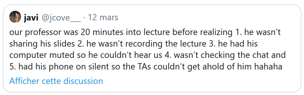 - La solitude de l’écran noir. En ligne, la plupart – que dis-je, la totalité – des étudiants désactivent leur caméra. Cela conduit donc à enseigner à des écrans noirs. On ne peut pas savoir si l’étudiant hoche la tête, s’il prend des notes de manière concentrée, s’il est très occupé par une discussion en parallèle sur son logiciel de messagerie, ou même s’il a quitté la pièce… Cela conduit à certains moments de solitude, quand on appelle Jim qui avait tapé une question et qu’on attend tous que Jim branche son micro… ou qu’il revienne dans la pièce. Quand c’est assorti à une faible utilisation du Chat, on a un peu le sentiment de parler face à une pièce vide.