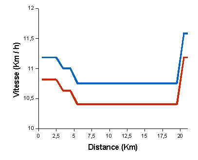 - Les courbes présentées ici donnent : en bleu, l’allure à laquelle je croyais courir ; en rouge, l’allure à laquelle je courais réellement.