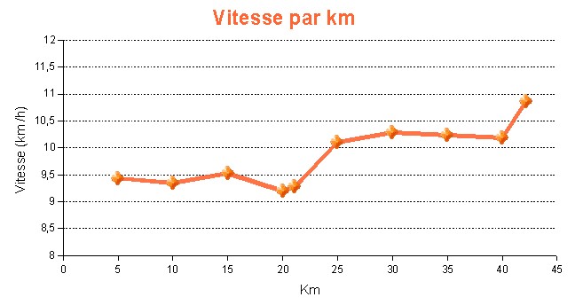 Conformément à ce que j’avais décidé, je chausse le casque du walkman à partir du semi : la première partie a été concentrée et silencieuse, la deuxième partie va être rythmée et en musique. J’accélère pour passer à 5’40 » au kilomètre, et commence donc mon negative split. Dans ma stratégie de course, je dois maintenir cette allure jusqu’au km 31 : à ce moment-là, je verrai si je peux encore accélérer (5’30 » ou moins) ou bien s’il vaut mieux rester à cette allure. Un morceau de Graham Nash et David Crosby, un instrumental tiré de Rocky, la musique est agréable, et puis cette chanson faite pour la course, Men In Black, par Will Smith. Dopé par le rythme, je double des coureurs sans effort, sans à-coup, je suis dans la course.