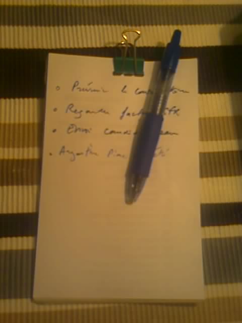 un carnet papier, que les geeks (dont je suis) appellent hPDA (hipster parietal disgorgement aid, approximativement « Assistant de poche pour vider son cerveau »), cherchez ces mots sur Internet, vous aurez de l’info…
