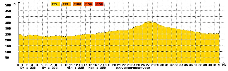Une longue côte (heureusement, pas forte, mais quand même…) entre le km 10 et le km 27, et après, poh poh poh, rien du tout, 15 km en descente, ça ne fait rien, à part taper dans les cuisses (qui n’auront avalé que 27 km, dont 17 de faux-plat) 🙁
