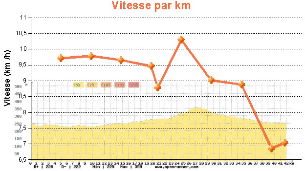 Le faux-plat imperceptible depuis le km 17 se transforme en côte, c’était prévu sur le relief, et je l’attaque sans réduire ma vitesse, comme c’était prévu : après tout, après le km 27, ça descendra, et tout sera plus facile. Je repère Joce avec les ballons du meneur d’allure pour 4h15, je grignote insensiblement la distance, et je la passe, je lui souhaite bon courage, puis je continue à mon rythme. Il fait chaud, le soleil tape, je n’ai plus froid et je sens que je vais avoir des coups de soleil. La pente est longue, je m’accroche, je perds souvent le rythme mais je remonte toujours pour me maintenir à une vitesse de 5’40 ».
