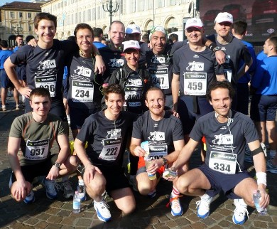 Nous arrivons au rendez-vous sur la Piazza San Carlo avec 10 minutes d’avance. Nos camarades arrivent un peu plus tard, nous en avons profité pour nous mettre au soleil, il fait super beau, ciel bleu, mais encore frais : +8°C. On nous promet que ça va taper plus tard dans la matinée. Nous prenons une photo tous ensemble puis direction la ligne de départ. C’est un tout petit marathon, en nombre de coureurs : 2 200 dans le peloton de départ, ce n’est rien à côté des 40 000 du Marathon de Paris. Du coup, c’est une ambiance plus détendue, il fait beau, une jeune fille qui chante faux nous assène l’hymne italien, et c’est parti, il est 9h20.