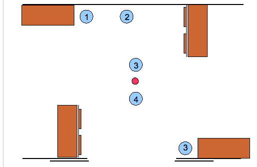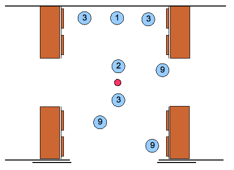 Si 1 n’est pas libre, prenez position sur 2, et attendez que 1 se libère. Éventuellement, optez pour un des 3 (celui près du poteau central est le meilleur, de là, basculement vers 2, puis recul vers 1).